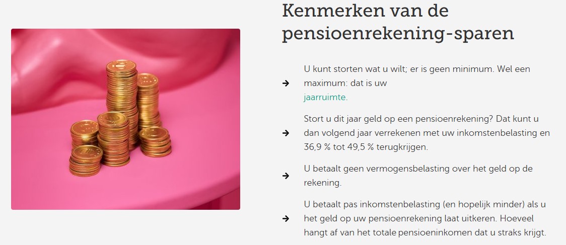 Het is alleen voor uw pensioen. Als u eerder geld wilt, moet u een boete betalen. Ook moet u bij pensionering een lijfrente kopen van het gespaarde bedrag. Zo krijgt u elke maand een uitkering.