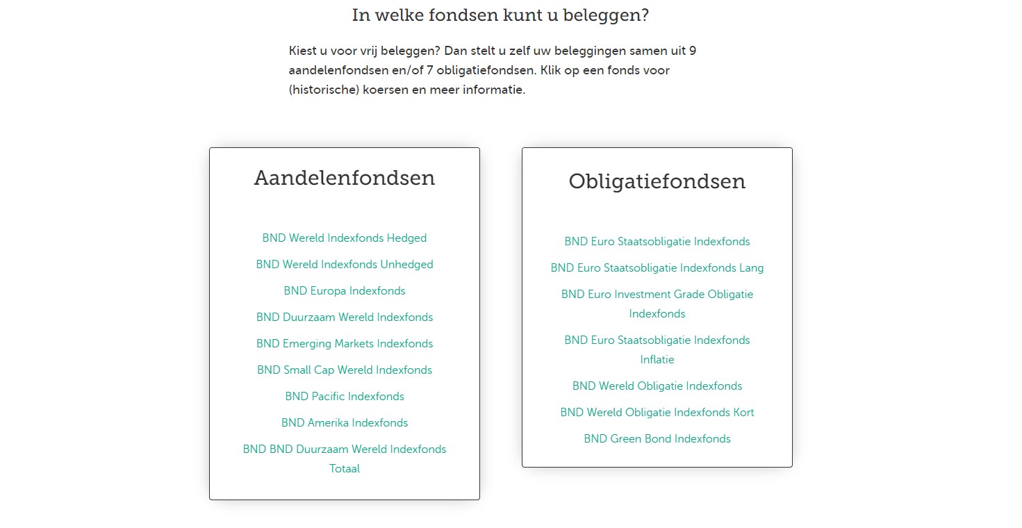 Je kunt bij hen kiezen voor modelbeleggen. Dit houdt in dat je risico en investeringen automatisch worden verdeeld. Brand New Day werkt met fondsen van Northern Trust en Vanguard, inclusief ETFs.