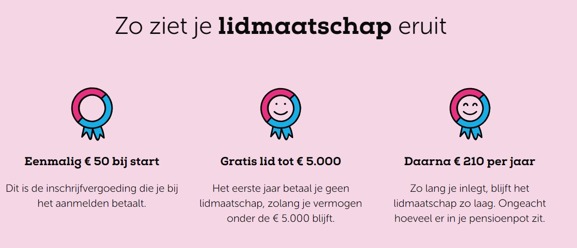 BrightPensioen werkt anders dan veel bedrijven. Ze willen geen winst maken. In plaats daarvan betaal je een vast bedrag per jaar. Voor één persoon is dat €210. Koppels betalen samen €360. Dit heet een lidmaatschap.