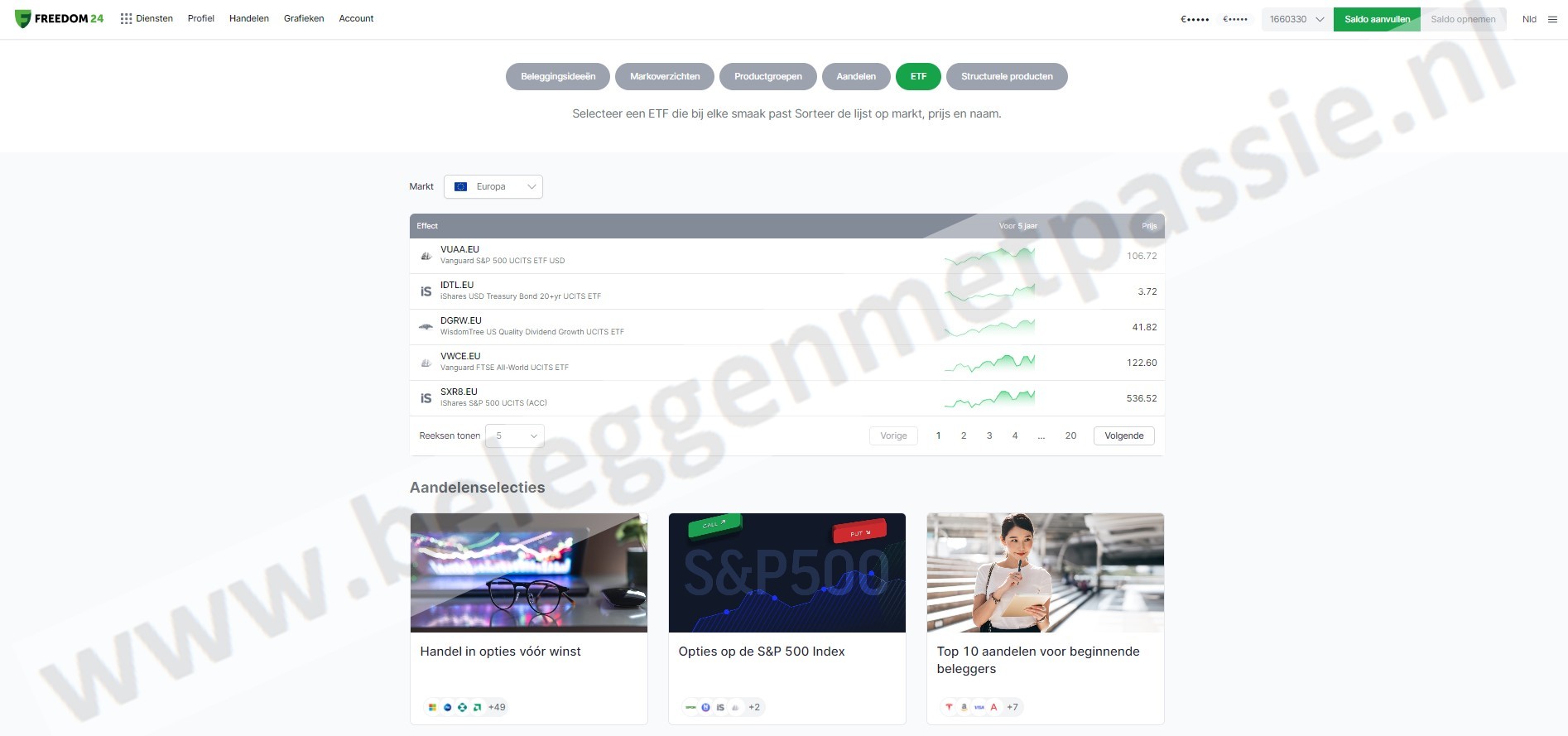De kernselectie ETF’s vormt een groot pluspunt voor DEGIRO. Je handelt één keer per maand zonder commissiekosten in deze fondsen. Freedom24 biedt deze optie niet.