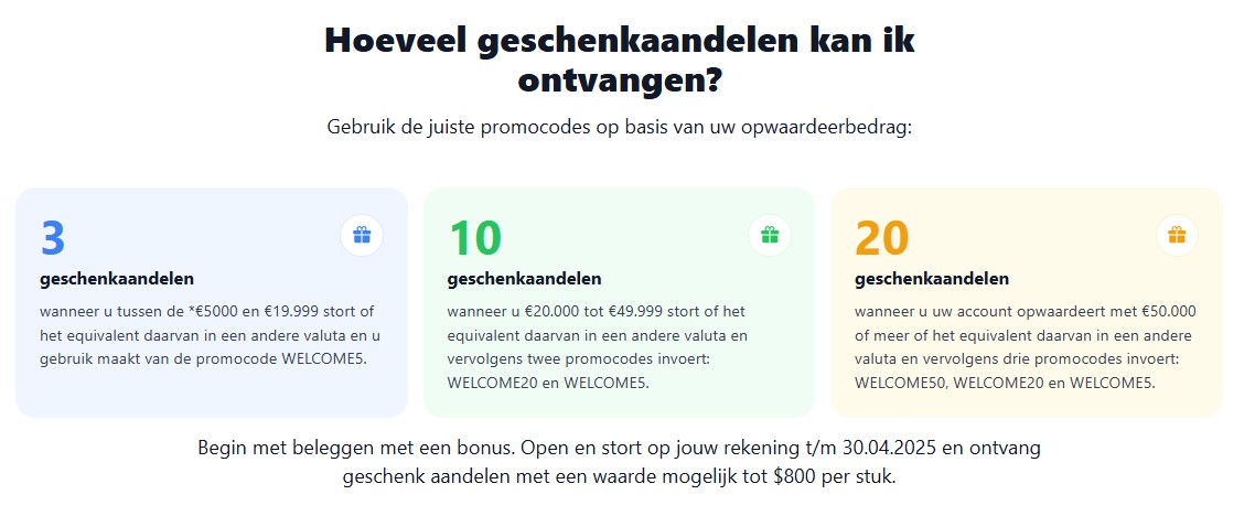 - Voor stortingen tussen 5.000 EUR en 19.999 EUR (of het equivalent in een andere valuta) wordt de code WELCOME5 op de rekening geactiveerd, waarbij drie Gift Aandelen worden toegekend, elk met een waarde tussen 4 USD en 800 USD.