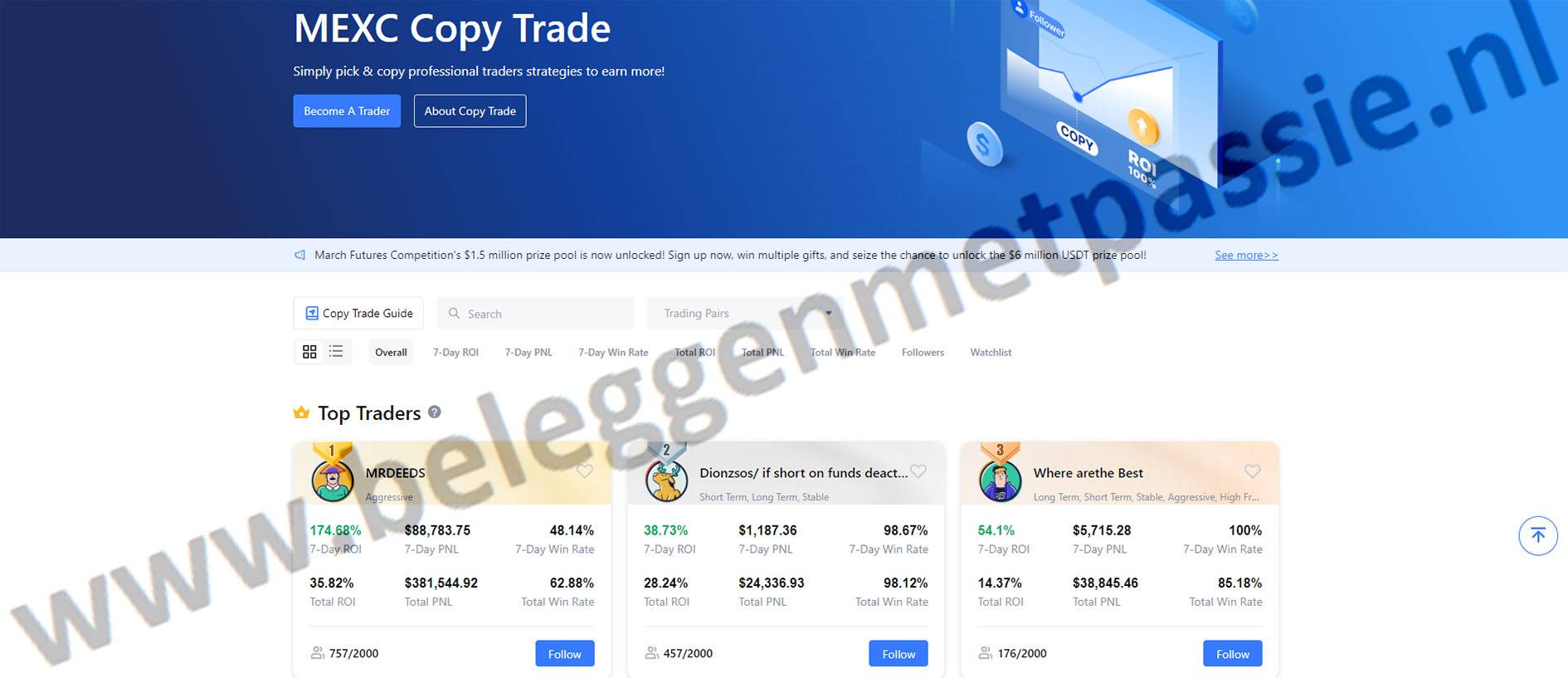 In het menu van de futures heb je ook de optie Copy Trade. Hier krijg je toegang tot heel veel experts en hun trades. Doe altijd je eigen onderzoek maar ik zie dit als een zeer waardevolle bonus om zelf hier en daar het maximale uit te halen.