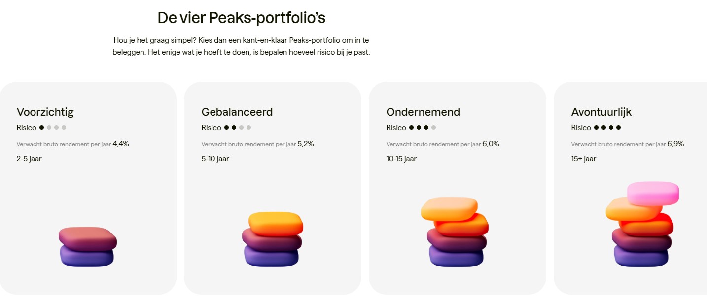 Met Peaks kun je kiezen uit verschillende beleggingsportefeuilles. Deze passen bij jouw doelen en risicobereidheid. De app belegt in indexfondsen met lage kosten. Dit zorgt voor een goede spreiding van je geld.