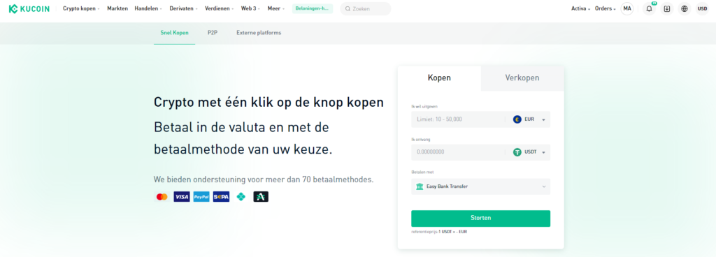 KuCoin biedt beperkte ondersteuning voor fiat-valuta’s zoals euro’s en dollars. Dit betekent dat je geen directe aankoop van cryptocurrency kunt doen met je gewone geld. In plaats daarvan moet je al cryptocurrency bezitten om te kunnen handelen op KuCoin.
