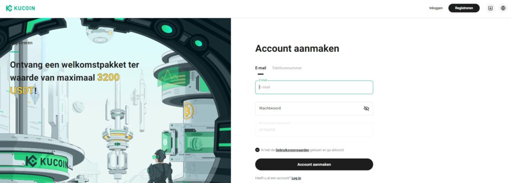 Om je te registreren bij Kucoin, ga naar de speciale website voor de 3200 USDT actie en klik op de knop ‘Registreren’. Volg vervolgens de stappen om een account aan te maken met je persoonlijke gegevens.