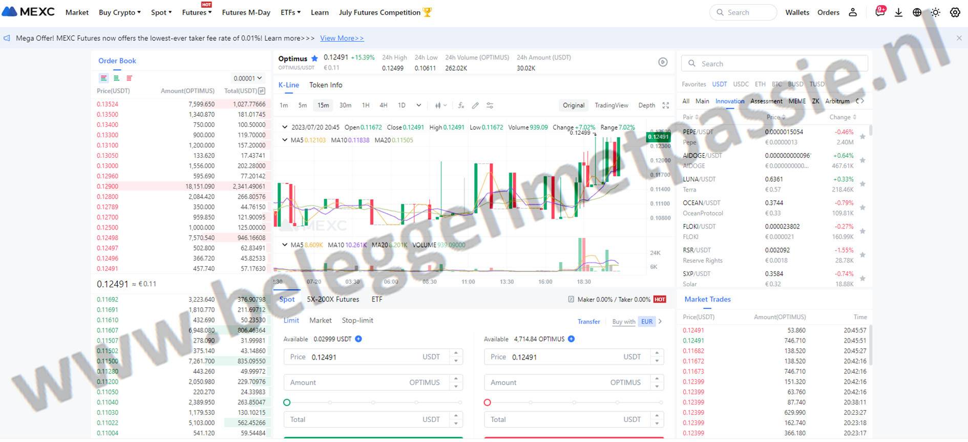 Als u een liefhebber bent van cryptocurrency, zult u blij zijn te weten dat de Mexc-uitwisseling een enorme selectie van meer dan 1500 cryptocurrencies biedt. Dit betekent dat u kunt handelen en beleggen in een breed scala aan munten, van populaire zoals Bitcoin en Ethereum tot meer niche-opties zoals Cardano en OPTIMUS (laatst genoemd heb ik zelf bijvoorbeeld)