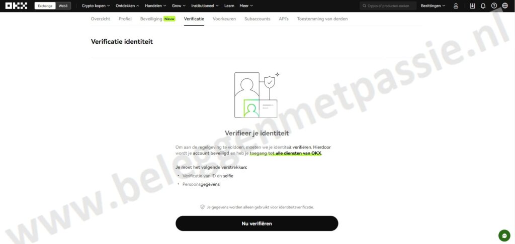 Na het aanmaken van je account, moet je nog een paar stappen doorlopen. OKX vraagt om je identiteit te bevestigen. Dit heet KYC (Ken Je Klant). Het is nodig om veilig te handelen.