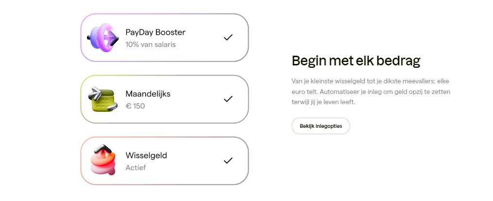 Dat kan automatisch bij elke aankoop, of met een vast bedrag per dag. Ook kun je tot €10.000 in één keer storten. Zo bouw je makkelijk een gevarieerde portefeuille op.