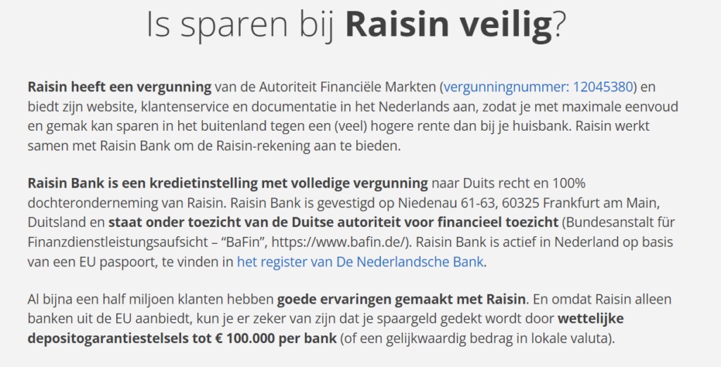 Raisin werkt als tussenpersoon met een Duitse bankvergunning. Dit zorgt voor extra veiligheid via het Duitse garantiestelsel. Let wel op bij sparen in andere valuta. De garantielimiet kan dan verschillen.