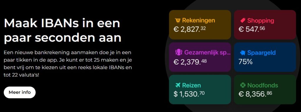 - Spaarrekening: Mogelijkheid om geld apart te zetten met dagelijkse rente tot €100.000.